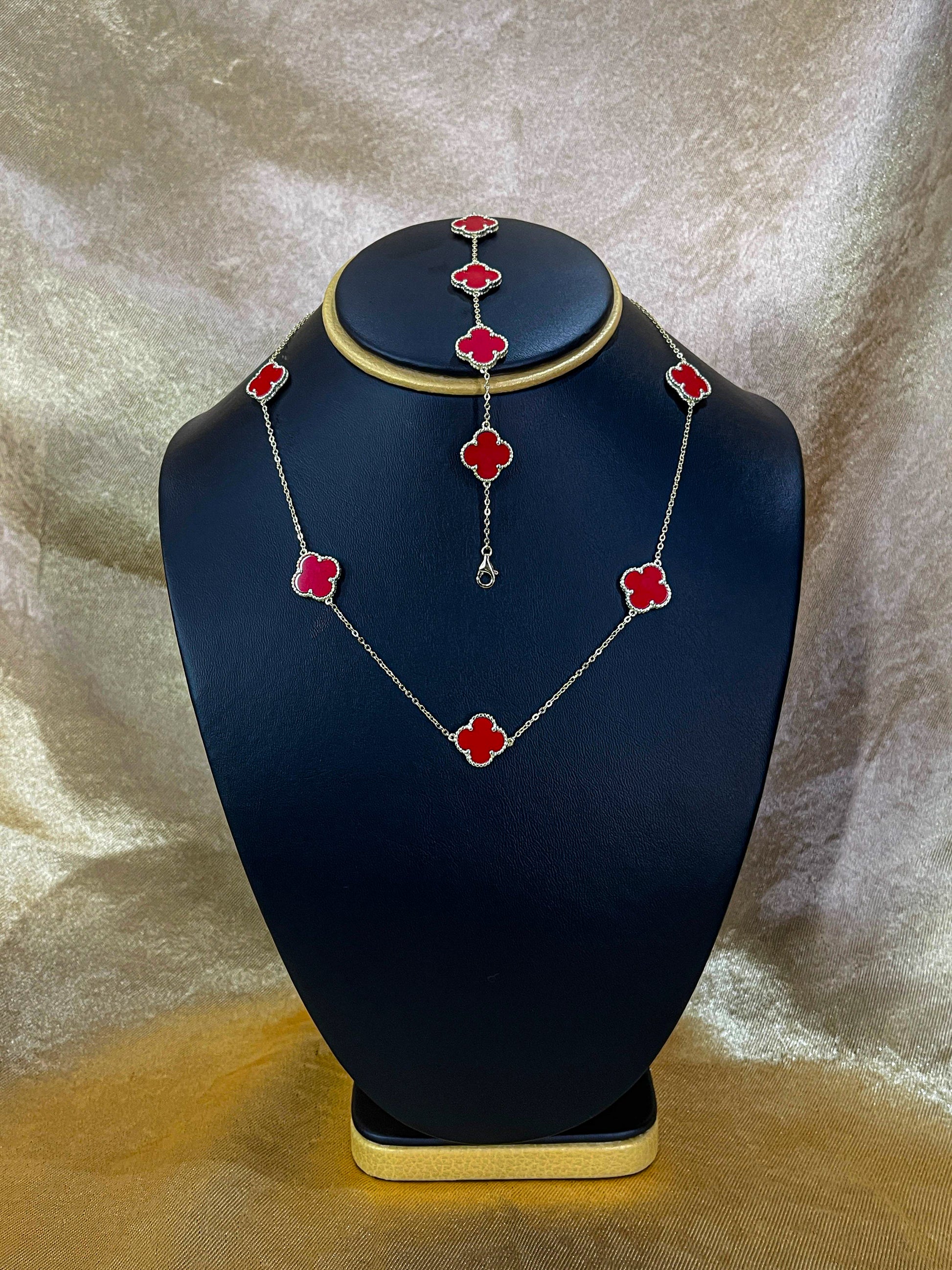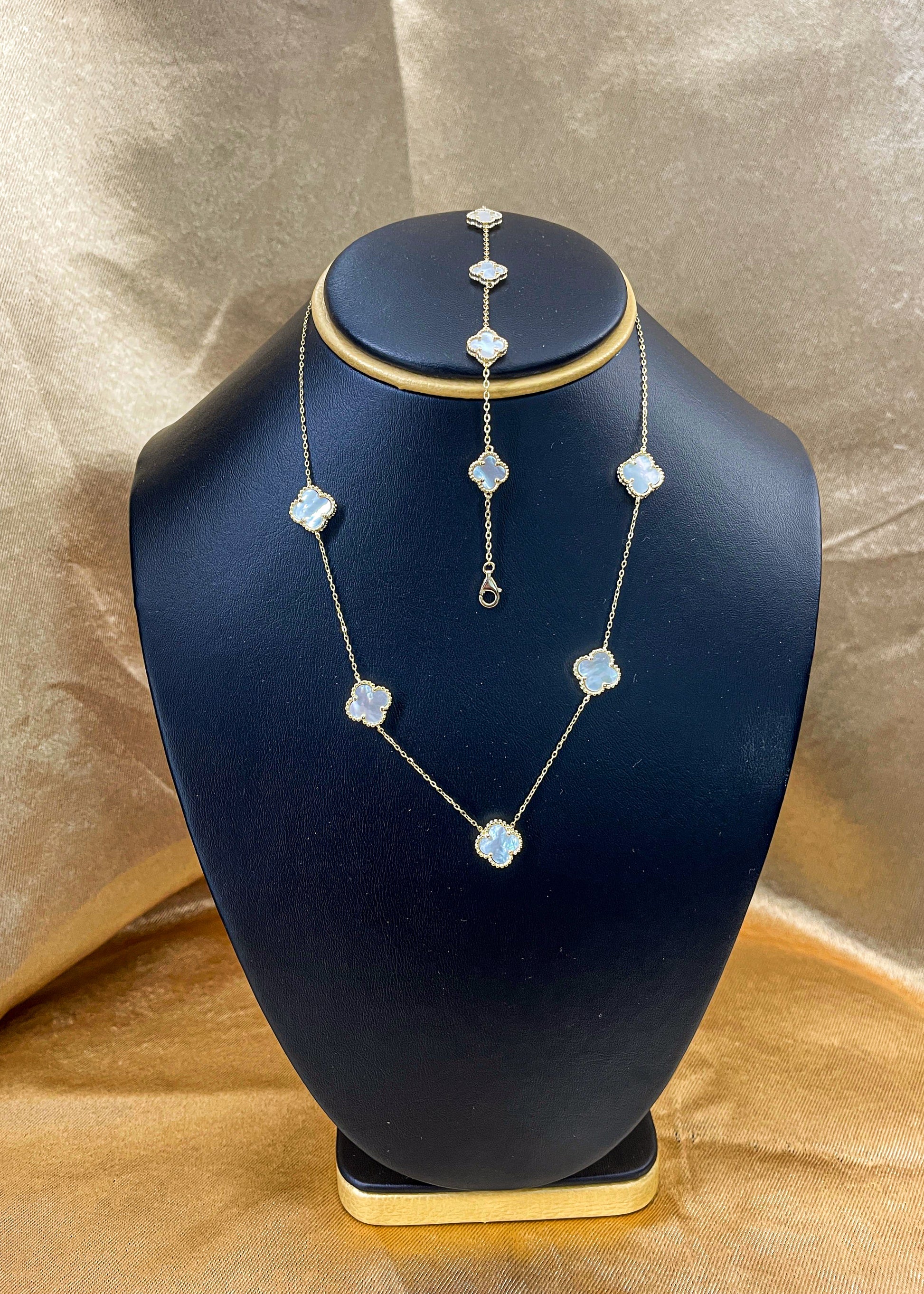 Elegancia delicada en cada detalle. Este set incluye un collar y una pulsera elaborados en plata bañada en oro con delicadas flores de madreperla blanca. Las piezas están unidas por una fina cadena que aporta un estilo moderno y sofisticado. Perfecto para eventos especiales o para dar un toque refinado al día a día.